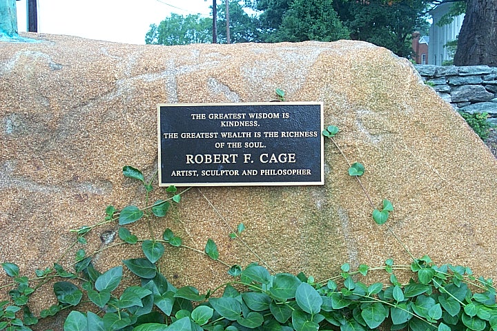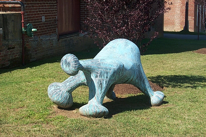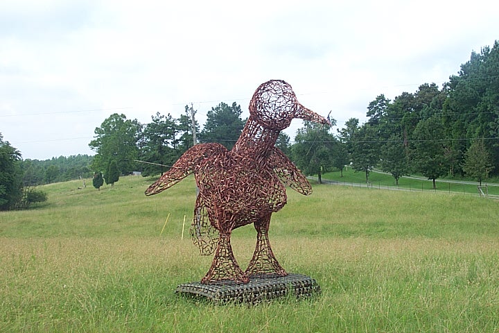 Sculpture Garden by Beth Robertson, The Gazette-Virginian, May 2, 1997 Jet engines might take the massive, metal bird airborne, but it would probably take just that. Scattered across the rambling field at the corner of Cage Trail and Shanti, perhaps 30 original sculptures constantly capture the attention and imagination of fascinated passersby. Artist R.F. Cage's idyllic hideaway - turned sculpture garden - is turning heads as local residents and tourists cruise by, sometimes bumper-to-bumper, marveling at the metal giants. The artist appears both perplexed and pleased by the reaction. "It is surprising to me, this response," acknowledged Cage, particularly, he notes, in a rural area where art museums are few, particulairly those featuring abstract works. His work, he suggests, "Generally calls for creative viewing," but not all. Within the ranging sculpture garden one finds warriors, a white horse and buggy, a planet and friends and lovers among a host of otherwise abstract pieces. "The ones who give me an extra charge are the kids," continued Cage, who was once described as the pied piper of art during a school tour. The artist particularly enjoyed a recent visit by a group of Mecklenburg County high school students. "They were just so motivated, so interested in everything," recalled Cage. "Sculpture, painting. They even wanted to go into the house." For Cage, art has long been a life-style, with the winding lane leading into his farm flanked by sculptures, both metal, wood and copper. A narrow, log bridge arching over Shanti's private entrance, an artwork in itself, not only heralds the charming pond and cabin-dotted setting to come, but is designed to allow Cage's small herd of goats a field-to-field crossing. A sight to behold, both children and adults are delighted by this functional Cage addition. A sculptor, painter, champion tennis player and World Champion Tobacco Auctioneer, Cage's whirlwind schedule always includes art. "I do it because I have to do it," explained the artist. "But it is not complete unless someone responds. If my work gives others pleasure, that is an extra bonus. Nothing is worth much if you can't share it." Cage's next sculpture and painting exhibit opens this weekend at The Danville Museum of Fine Arts and History in Danville at 975 Main Street. His work will be on exhibit in the Jennings Gallery in Danville from May 4 to June 2 (1997). On Sunday, at 2:30 p.m., a short film for Sundance featuring dance, choreography and art, which includes Shanti, will be shown. Preparing for the exhibit is no easy task, confessed the artist. In his case, moving sculptures often includes words like wrecker, flat-bed truck and a multitude of helping hands. Still, it is sculpture Cage calls his easiest medium. His goal: "To invest metal with poetry, resurrect it and give it new life," he explained. But first he has to find the metal, which may include trips to junkyards, farms and even odd farm implement castoffs from friends. His search for ancient trees is legendary, often the remnants of natural disaster whose massive trunks are transformed to share their beauty once again, this time as a mixture of smooth curves and sudden angles aglow in rich patina. Obviously, the massive sculptures take many hands. Cage and his son Fielding combined efforts on several of his earlier works, woodland copper sculptures beautifully aged now by the passing years. And then there is Cage's cohort in creation, Malcolm Ragsdale. "Malcolm is so faithful," began Cage. "He's my hands. He welds, cuts and saws." Loading and moving to the Danville exhibit this week, Cage welcomed a second pair of helping hands, Willie White's. The multi-ton sculpture masses also "take a lot of upkeep," according to Cage. Fighting rust and repainting are mammoth maintenance tasks. Still, sculpture is "quicker and more spontaneous" for the artist. "You can make a quicker statement with steel." His paintings are another story. "I struggle with them," he confessed. "There may be three or four ghosts under one, one I didn't like and painted over. "I do a painting, think I like it, put it in my bedroom, and after a while I decide I can't stand the damn thing." But the artist never throws a canvass away, he simply paints over it. "One, one in my life I threw away," he corrected." At the Danville exhibit, Virginians will discover about four pieces of indoor sculpture and a half-dozen outdoor pieces and perhaps 20 paintings, described by the artist as "some abstract, some surreal and some semi-realistic." |