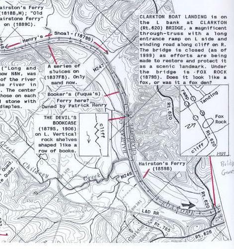Chart from Dr. Bill Trout's Staunton River Atlas HISTORICAL INFORMATION* The Clarkton Bridge derives its name from the Clark family, their plantation, and the village of the same name. There do not appear to have been any earlier bridges, ferries, or fords at this exact location. John Clark was a wealthy landowner who lived near Randolph in Halifax County. On his death in 1827, he left an estate of half a million dollars and a provision in his will to purchase plantations for his children. His son, Charles Adophus Clark (1821-1859), bought the "Rosebank" plantation on the Staunton River in Halifax County from the Yuille family; it was the only river plantation available at the time. Just before he married Eliza Ann Spraggins (1821-1897) in 1846, Charles Clark built "Hovelock" on the crest of a ridge about a mile and a quarter from the river (on present County Road 632) (Edmund [undated]: 1 19-120). After Charles Clark died in 1858, his widow, Eliza, managed the estate until it was inherited by their son, Thomas (1851-1919). Thomas added nearly 400 acres of land on both the Charlotte and Halifax sides of the Staunton River to the 5,600 acres he had inherited, making the plantation one of the largest bright tobacco farms in Halifax County. Com and cattle were also raised on the farm. Thomas Clark conveyed the Lynchburg and Durham Railroad (present Norfolk and Western Railway) a right-of-way through his plantation in 1889 in exchange for the construction of a station and express office. At his request, the station was named Clarkton and he also changed the name of his house to Clarkton. Prior to the railroad, the Danville to Richmond stagecoach had passed through Clarkton on its way to the Staunton River crossing at Coles Ferry. In the decades before the Great Depression, the village of Clarkton was a place of considerable activity. The Guthrie brothers ran a large general store, and a post office as well as the railroad depot were also located in the village. Following Thomas Clark's death in 1919, his widow, Grace, endowed St. Thomas Episcopal Church and a community center in Clarkton. In 1938, thirty-one tenant families were still living on the Clarkton plantation. The Clarkton Depot went out of service in the late 1950s, and the post office moved, but a general store still remains. F.G. Baldwin, J. Edward Baldwin, and L.D. Martin were commissioned in Halifax County Court's April term, 1900, and George R. Hannah, G.W. Berkley, and S.C. Daniel were commissioned in Charlotte County Court's June term, 1900, to determine whether a new bridge should be built across the Staunton River near Clarkton. The site selected for the bridge, known as "Rock Bluff,' was located about one-half mile below Coles Ferry. It was felt that the bridge would benefit the area by inducing more people to locate to these sections of the counties, thereby increasing land values. On January 8, 1901, the County Court followed the bridge commissioners' recommendations and authorized construction of the bridge. Charlotte County, Halifax County, and the Norfolk and Western Railway Company would each contribute $2,000 toward construction costs, with an additional $1,940 to be raised by private subscription. The Norfolk and Western Railway agreed to assist further in the bridge's construction by shipping all bridge material to the work site free of charge. The Virginia Bridge & Iron Company, of Roanoke, Virginia, was awarded the contract for the bridge. The bridge was to consist of two spans, each one hundred fifty feet in length, and two steel tubular piers set on solid rock with a horizontal surface. The Virginia Bridge & Iron Company also proposed to construct a crib protection below the low water mark for the river piers. Work was to be completed within six months of approval of the contract. By a legislative act approved on February 1, 1901, the Charlotte County Board of Supervisors was authorized to borrow money to pay for construction of the bridge by issuing bonds. In December of 1901, the Charlotte County Treasurer escrowed funds for bridge construction, indicating that the work could begin. One hundred dollars was paid to have a road constructed to the bridge on the Charlotte County side of the bridge. S.P. Daniel, an engineer/architect, was commissioned to superintend construction of the iron bridge. Bridge construction began on October 1, 1901, and the bridge was completed and ready for inspection on December 25, 1901. However, before the bridge was formally accepted by the county, a major flood occurred. The flood undermined the concrete in the center pier and washed away the approaches. In February 1902, Daniel reported that the damage resulting from the flood had revealed defects in the bridge's construction. The bridge pier nearest the Charlotte County side of the river was a hollow iron caisson, seven feet in diameter, into which was inserted a five-foot iron pier surrounded by cement. Daniel described the cement as being "of very poor quality." The pier had sunk, causing the bridge to twist upstream approximately three feet, breaking one tie-rod and possibly weakening others. Daniel believed that the central pier had failed because it had not been sunk to solid rock and was also incorrectly designed. He contended that the fifteen-foot spacing between the two sets of piers was not sufficient to prevent the bridge's collapse during a period of high water and wind. Daniel suggested that the piers be placed twenty-five feet apart instead of fifteen feet, and further suggested that the county conduct a thorough load-bearing test before accepting the bridge. The Virginia Bridge & Iron Company had already begun repairing the flood-damaged bridge by the middle of January 1902, using a work force of between three and twelve men. Commissioner Daniel reported that the work proceeded slowly because of continuing floods and also due to the company's general mismanagement of the project. On June 12, 1902, it was reported