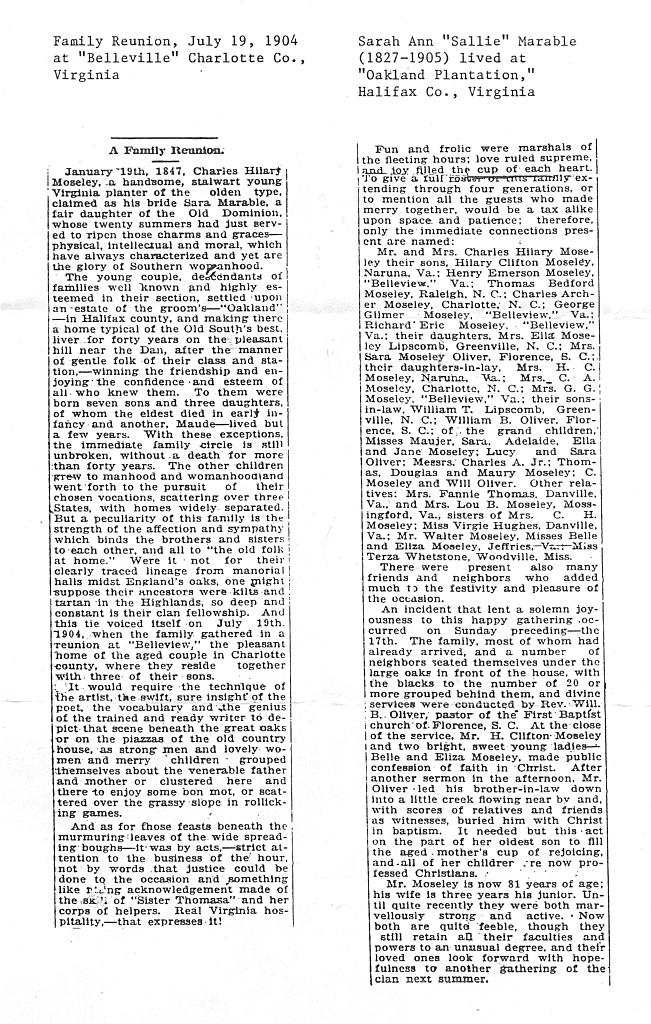 Matthew Marable, the burgess, was in Lunenberg County as early as 1754 as he was a burgess there until 1759. His father, William, established Finneywood Plantation in 1747 in Mecklenburg County where Matthew also served as a burgess from 1769 until 1776. Matthew eventually owned property in Lunenberg, Mecklenburg, Charlotte and Halifax Counties. Halifax Plea Book I, 1752-1755, p. 30, shows several entries for Matthew and William in the area of Difficult Creek, and Halifax County Deed Books 2,3,4,5, and 6 show numerous land transactions involving both Matthew and William. On September 10, 1938 the Reverend and Mrs. W.T. Creath, then residents of “The Cedars” hosted a family reunion for the Marable family at “The Cedars,” the ancestral home of the Marable family. (News story at right) Numerous Marable descendants attended the reunion including Thomas Bedford Moseley Sr. (1854- ? ), the son of Charles Hillery Moseley and Sara Ann “Sallie” Marable who lived for 40 years at “Oakland” near the Dan River. (Per Hillery Moseley’s will in 1856 in Charlotte County, Charles H. Moseley’s “Oakland” property was formerly owned by John C. Carter. The 460 acres was located on the south side of the Dan River at Win’s (Wynn’s) Creek which is about one mile west of Paces Bridge.) News story: Family Reunion, July 19, 1904, at Belleville, Charlotte Co. Virginia. He was the nephew of John Richard Marable, my great grandfather, and my grandfather's first cousin. Back to Map |