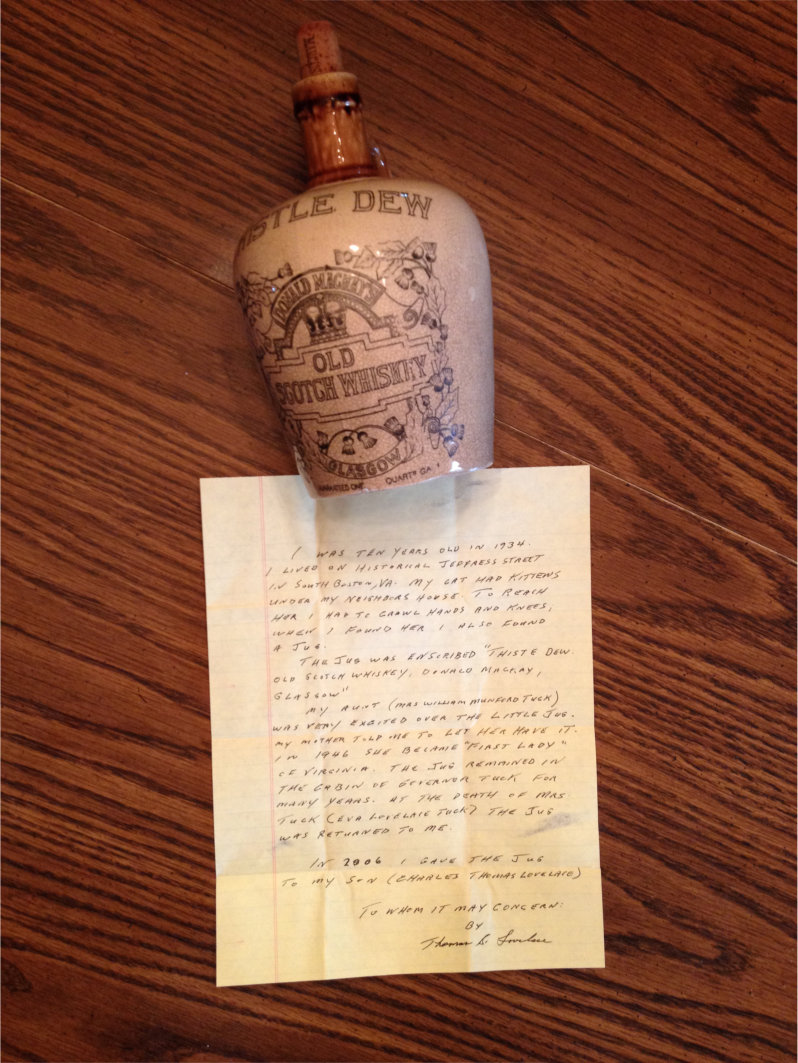 Once Governor Tuck's Home Built in 1888 on land purchased from Capt. Jeffress by Charles Thomas Lovelace. His son was Charles Branch Lovelace who worked 50 years at the Post Office and retired as its Postmaster. Daughter Eva married to Governor Bill Tuck and lived in the house. Grandson Thomas Skinner Lovelace describes the whiskey jug he found at a neighbors house in 1934 when he was 10 years old.
