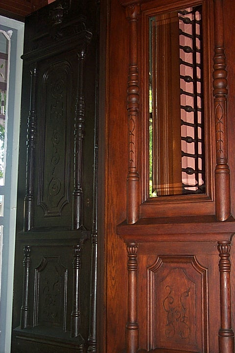 There are two sets of matching entrance doors. The interior doors are differentiated only by the beveled glass center. Through this glass you can see the twin side louvers for ventilation.