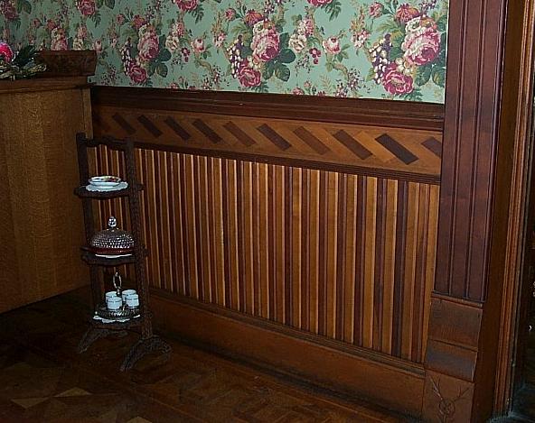The dining room wainscoting consists of four different types of wood.