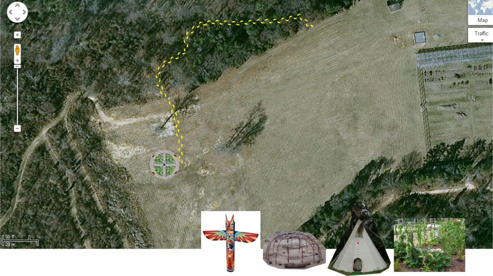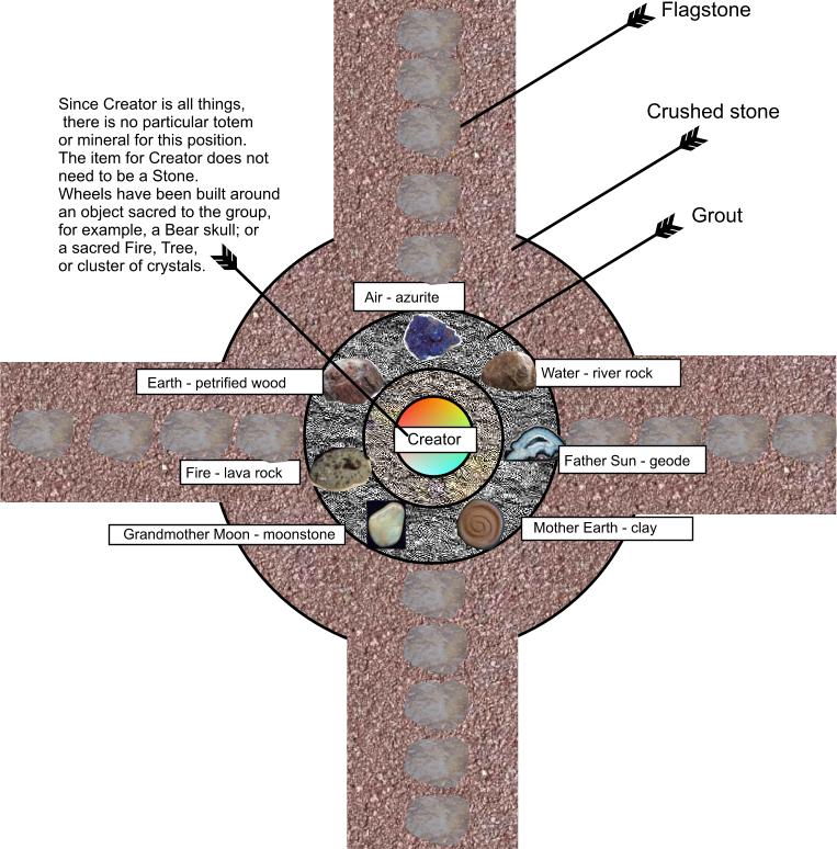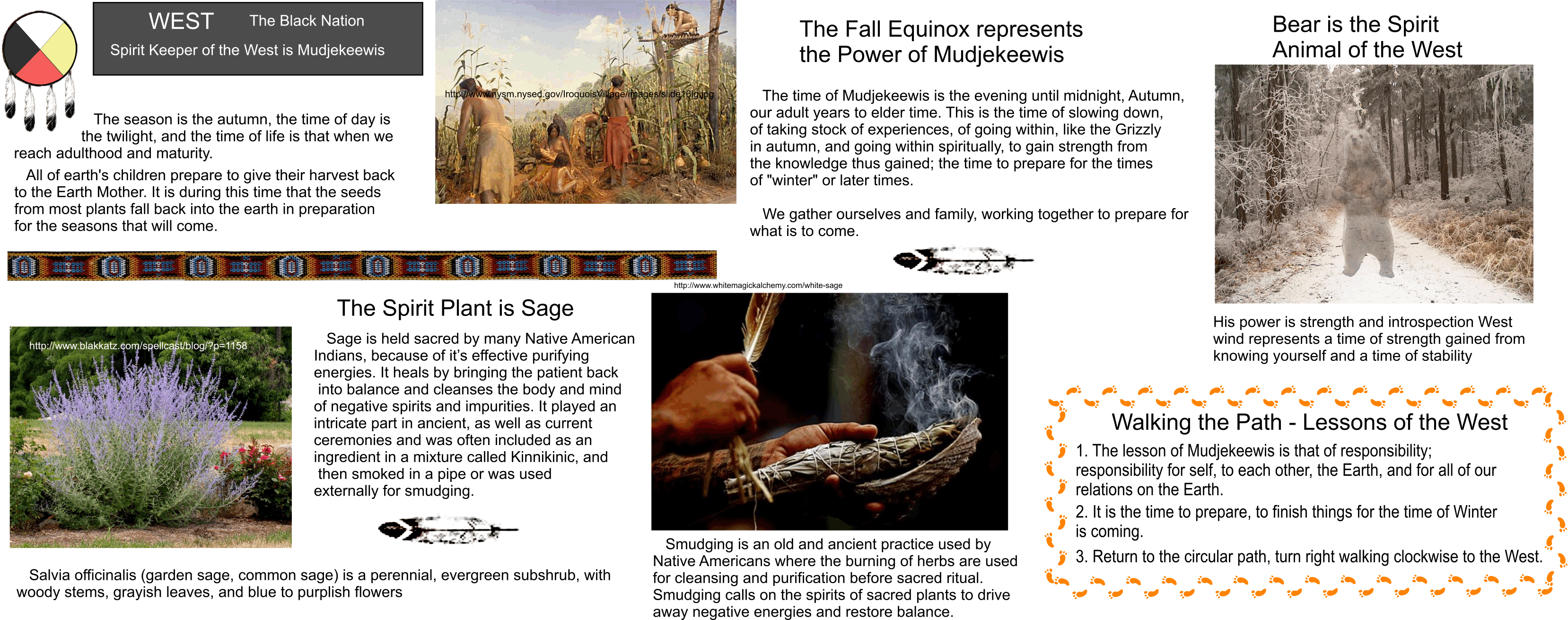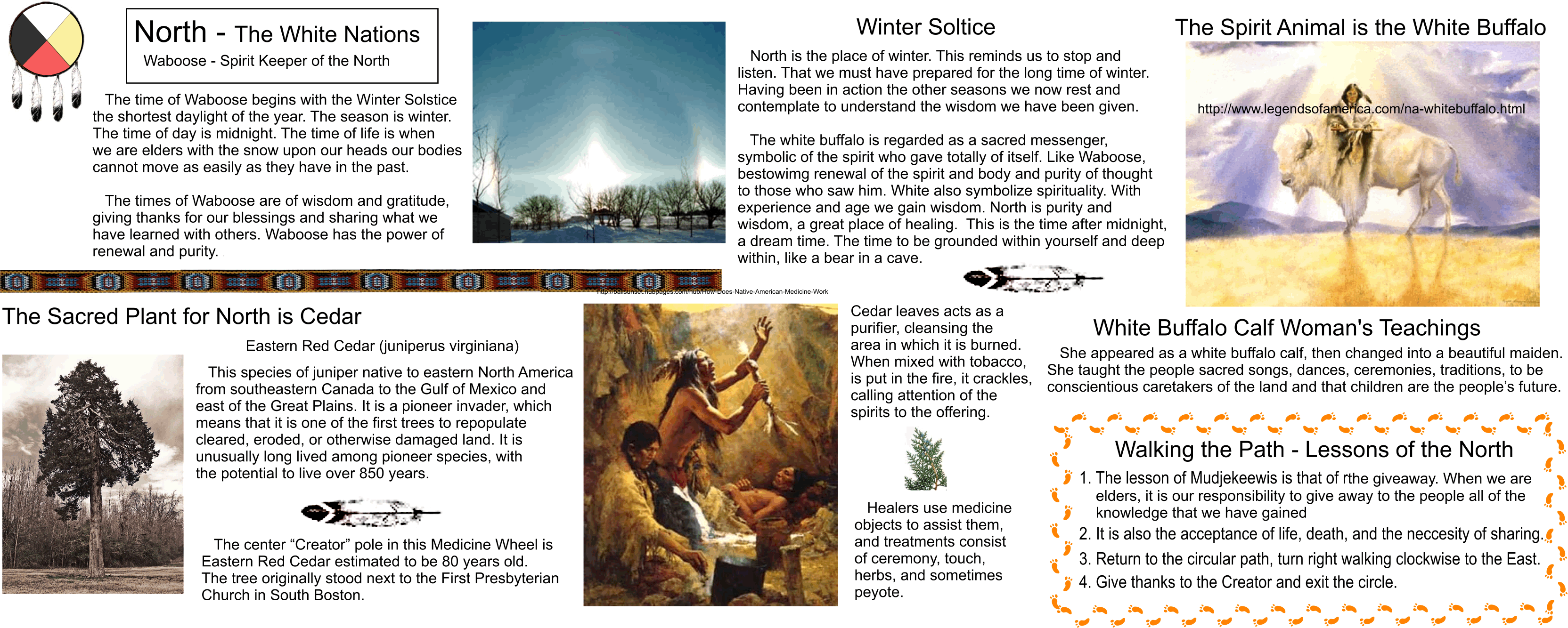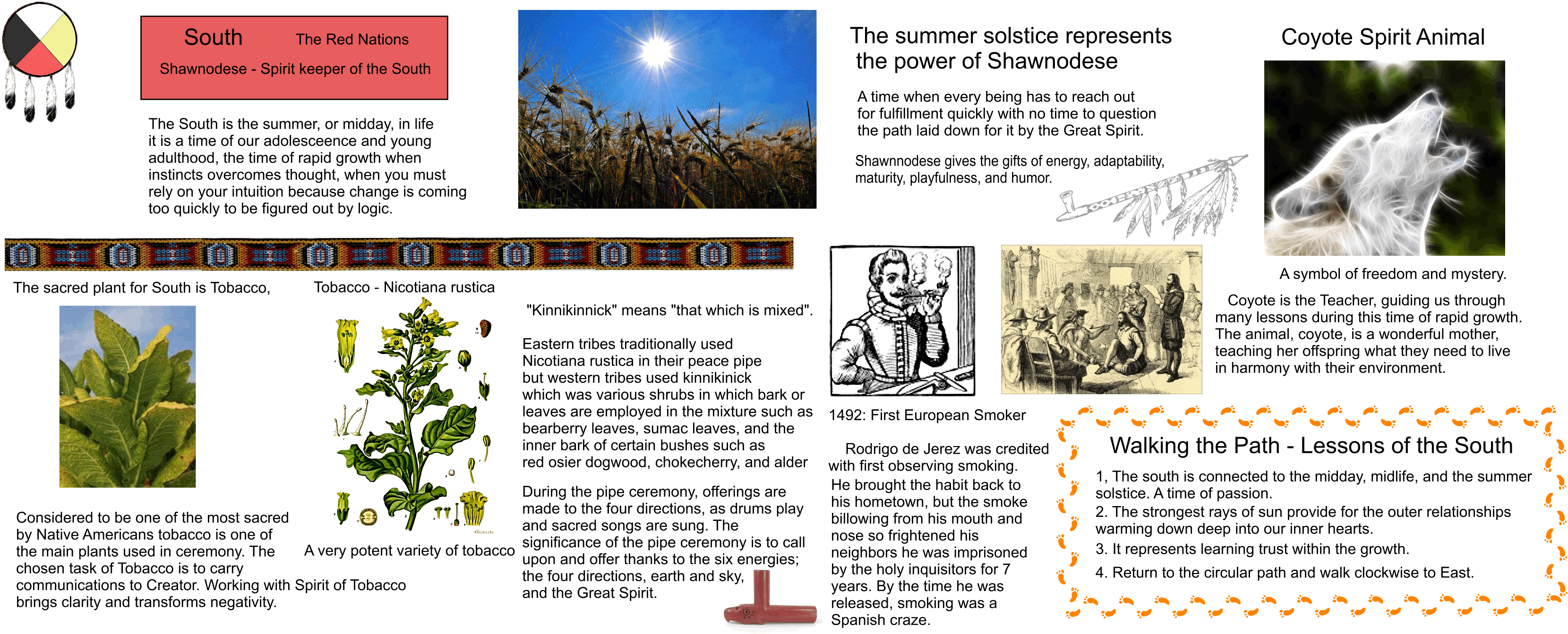 The four segments represent the spirtual meanings of the four cardinal directions along with their representative spirit animals and sacred plants. The ceremonial use of tobacco, sage, sweetgrass, and cedar are represented. The Medicine Wheel is from the culture of the northern plains tribes. See full map here.