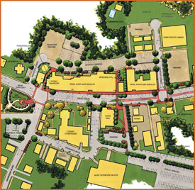Issues Several primary issue areas were identified for the Halifax downtown area, including: Overhead utilities Roadway and traffic design and management Parking quantity and accessibility Pedestrian use, including walks, green areas and public plazas Streetscape materials and themes Signs Land use and building facades and access In order to fully study each of these areas and to develop overall recommendations for addressing the issues, several community subcommittees were formed to provide inventory and analysis. The six subcommittees included: Signs, Materials and Themes Parking, Walking and Greenspace Traffic Water, Sewer, Drainage and Sidewalks Overhead Utilities Land Use Based on each of these issue areas, recommendations were developed for the following elements. A summary of the plan analysis and recommendations is provided on the following pages, organized around the following elements: Traffic and Roadway Design Streetscape Enhancements Parking Pedestrian Circulation Signs and Facades Community Gateways Overall Master Plan Recommendations The following illustration provides an overall master plan of the study area. The study area for this project was divided into two zones, one the "Core Downtown Area" from Cemetery Street north through Mountain Road, and the other the "Approach Area" from Toots Creek north to Cemetery Street. Separate but related recommendations were developed for each of these zones. Pictures illustrating the deteriorated existing conditions are also provided. Main Street Traffic and Roadway Design U.S. Highway 501 is a main truck route through the Town. Along with the cars bringing people to do business at the courts and the regional jail, this highway creates a dangerous pedestrian condition throughout the business area. There are no marked pedestrian crosswalks and accidents include one fatality in recent years. The paved roadway is wider than necessary for the traffic, leading to a tendency for higher travel speeds than desired as well as to difficulty in pedestrian crossings. The plan recommends a series of "traffic calming" measures that will address both of these issues while providing needed tree and greenspace planting areas. Typical roadway sections were developed for each zone of the roadway.