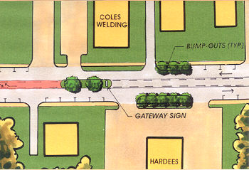 Southern Gateway. The Southern Gateway to downtown was first considered to be located at Toots Creek and the railroad crossing. The plan recommends, however, that the formal downtown gateway be located on Main Street north of the railroad crossing. A curve in the road at the transition from the more intensive gas station and restaurant businesses to a more residential character provides a better transitional area into the downtown.